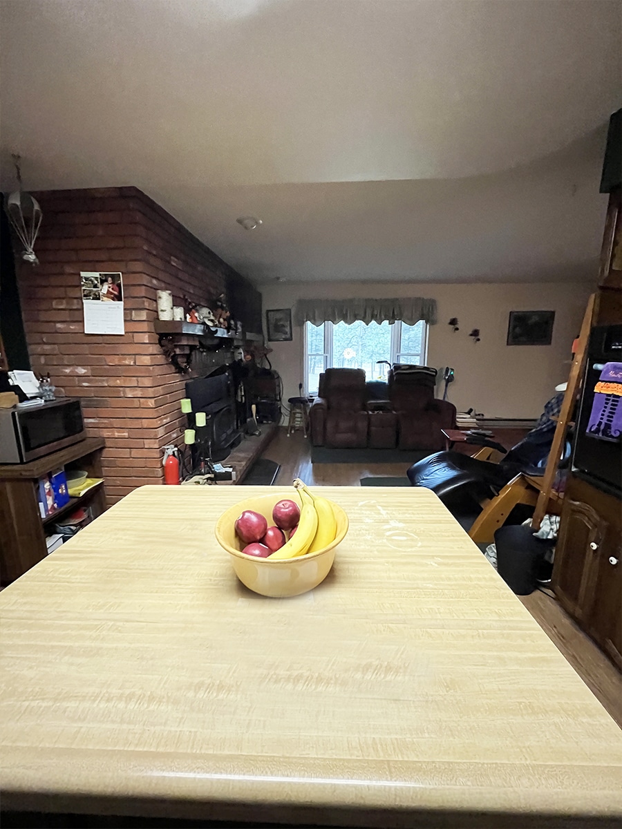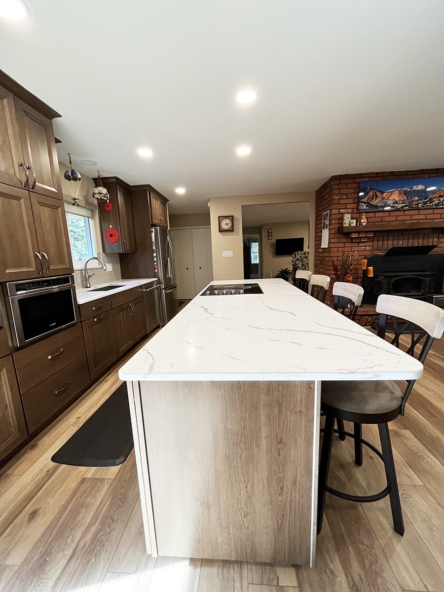 We removed the pass-through peninsula that separated the kitchen from the dining area and the soffit around the kitchen to make room for the new open expanded space which also lets more natural light in the new kitchen area. We moved the dining table to a new location in the home, a larger more spacious cozy space by the fireplace.