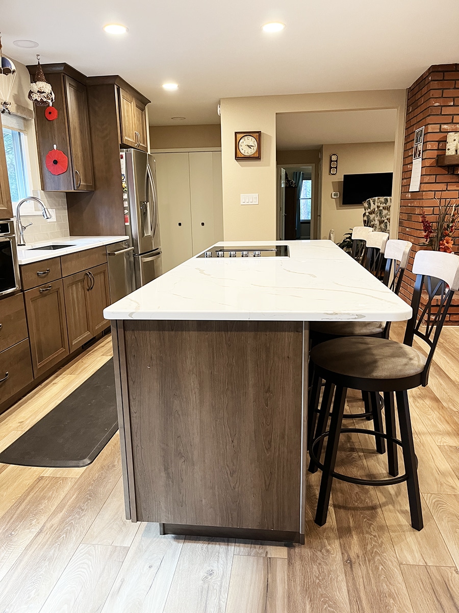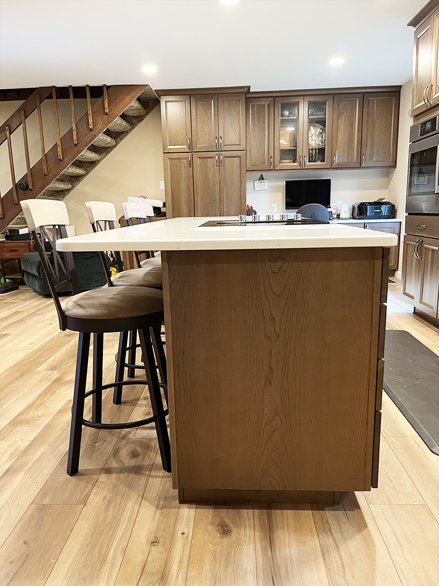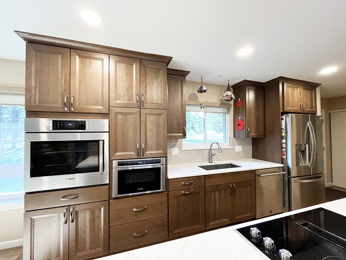 Rich cherry wood cabinets with a medium stain and customized tall cabinets puts the appliances at the height the homeowner needed them and creates excellent flow for cooking. The new large island has a cooktop, a hidden lift system for the heavy mixer and much wanted storage for additional cooking and baking equipment. New counter stool seating for four is great for those family and friend get togethers.