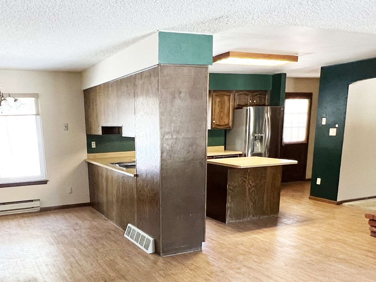 We removed the large ceiling light box along with the popcorn ceiling to create a clean cohesive space which is further improved by adding new led flush can ceiling lights and a new light paint color. Widening the doorway to the living room, all new doors and trim throughout the main level just keeps putting this home remodel into this decade.