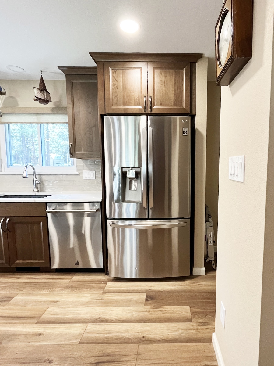The new beautiful realistic luxury vinyl plank flooring now runs throughout the space including the adjacent living room, dining room, hallways and into the laundry room off the kitchen.